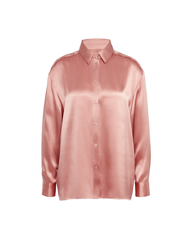 This loose-fitting button-down silk shirt has breathability and movement. The shoulders feature a panel of delicate embroidery on sheer lace for a subtle touch of elegance that sets it apart. Made for styling or sleeping, this is one piece you’ll feel amazing in.