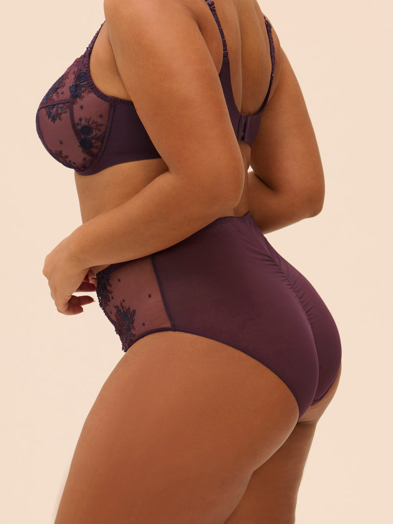 A little retro—and very sexy—the Intrigue Retro Brief is pure poetry. It’s made entirely from sheer stretch tulle, lined in the front for a smoothing effect, and flanked by delicate floral embroidery along the hips. For a flattering finish, there’s a touch of ruching in the back. Pick from colors Black, Disco Pink or Cinder Blue.