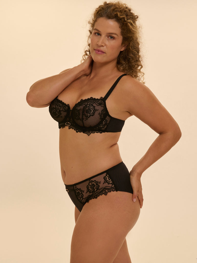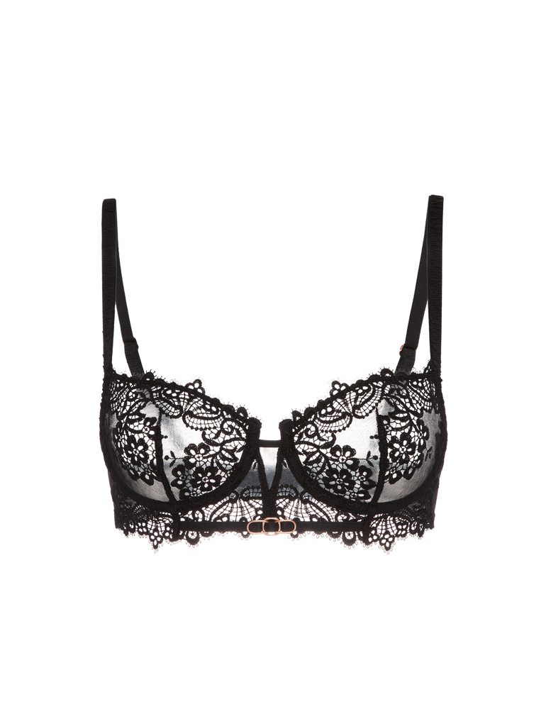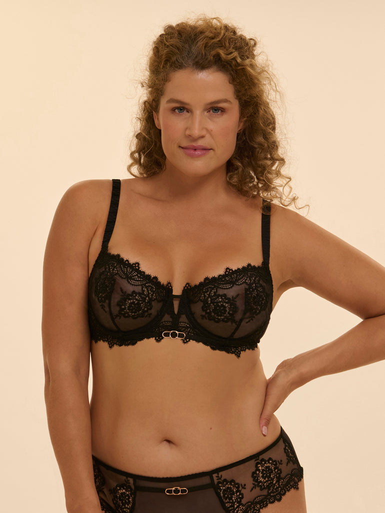 A couture interpretation of the iconic French demi. The Idole Sheer Demi is crafted from exquisite Italian tulle, adorned with intricate embroidery and finished with rose gold hardware. Delicate yet powerful, it’s lingerie as art—designed to be admired as much as worn. Limited edition.