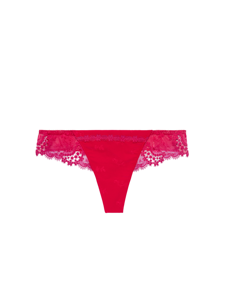 With panels of embroidered tulle and dazzling lurex threading, Italian satin Jacquard and a barely-there sheer thong back accented with an embroidered flower, this thong is absolutely stunning. Perfectly French, infinitely seductive, and everything you could wish for to complete your look.