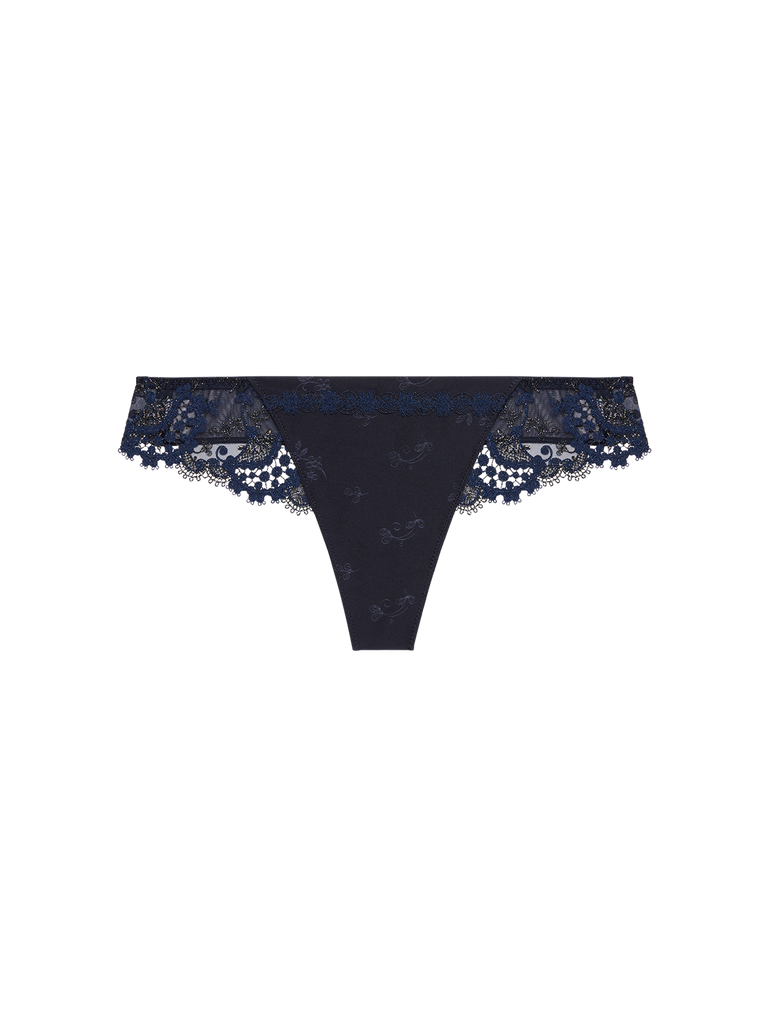 With panels of embroidered tulle and dazzling lurex threading, Italian satin Jacquard and a barely-there sheer thong back accented with an embroidered flower, this thong is absolutely stunning. Perfectly French, infinitely seductive, and everything you could wish for to complete your look.