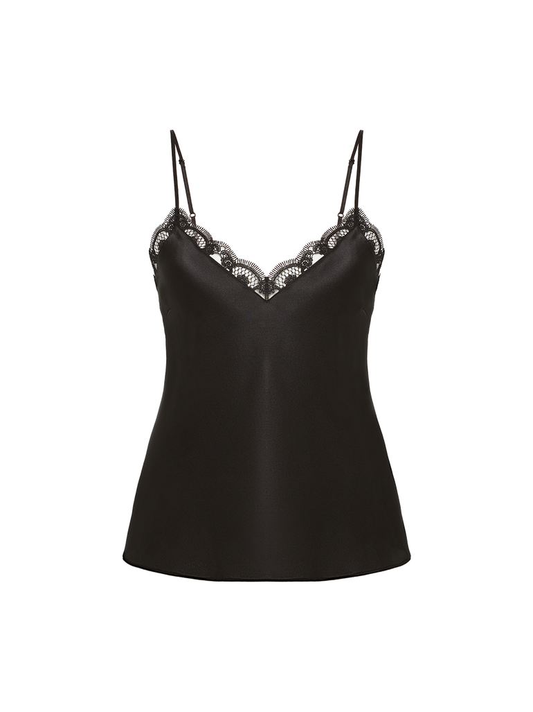 A stunning pure silk tank with ultra-fine embroidery and eyelash lace trim along the neckline, sides, and back. Featherlight, dream-soft and drapes well, with a flattering, soft V-neckline and adjustable spaghetti straps to customize your fit.